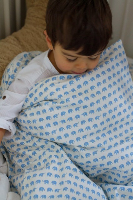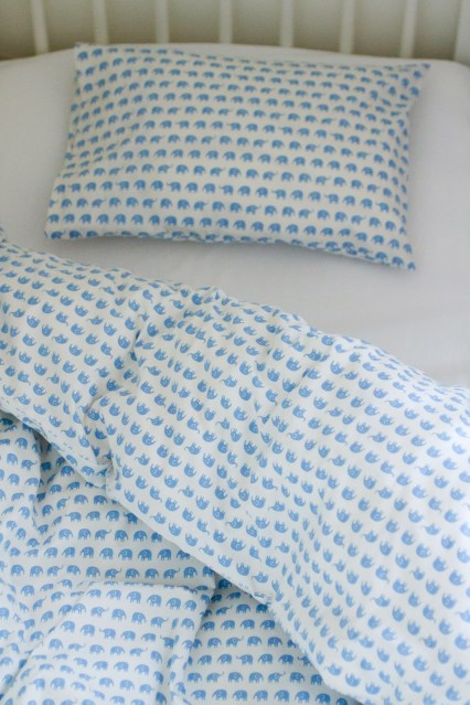 This duvet cover couldn’t be simpler to make: I bought two flat sheets and stitched a piece of border anglaise (eyelet) insertion on one of them (I used the same insertion nearly two years ago on a sheet for Rodrigo, remember?). Then I sewed along the top and sides of the sheets, right sides together, leaving the bottom part open. I turned the whole thing right side out and iron it.
