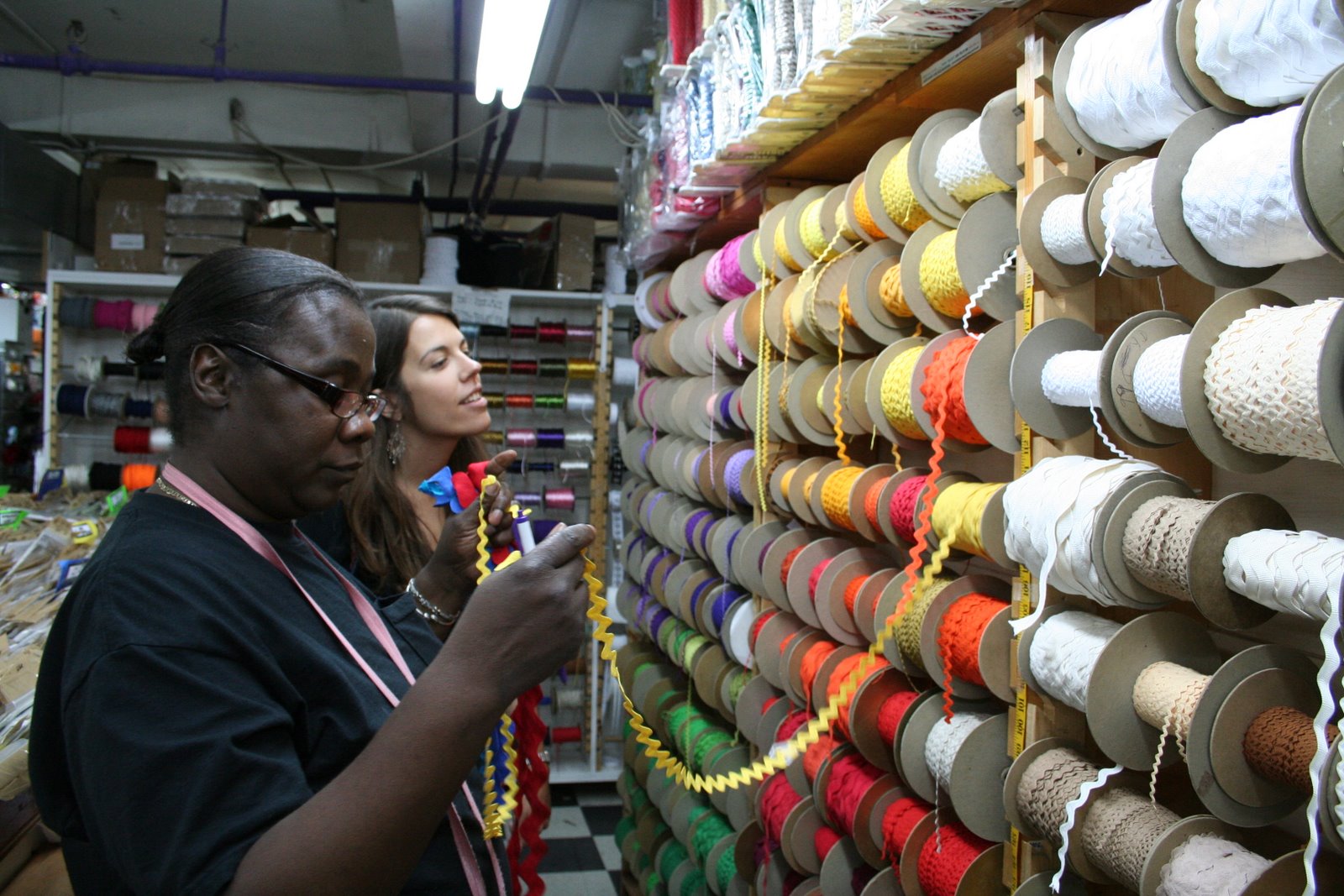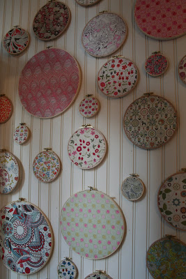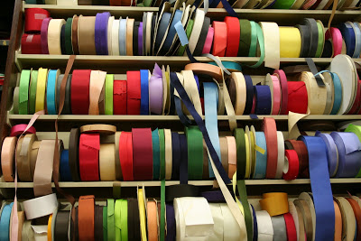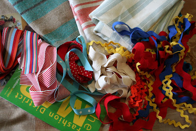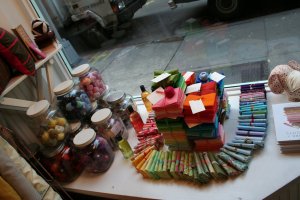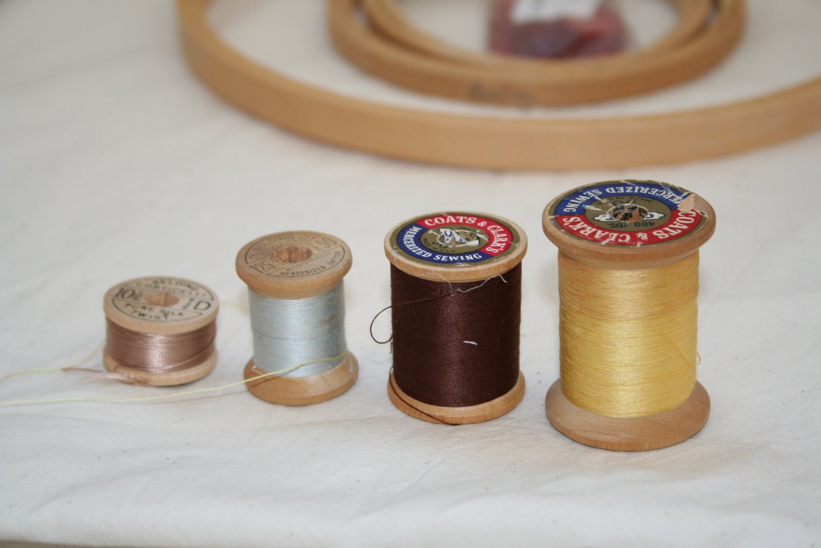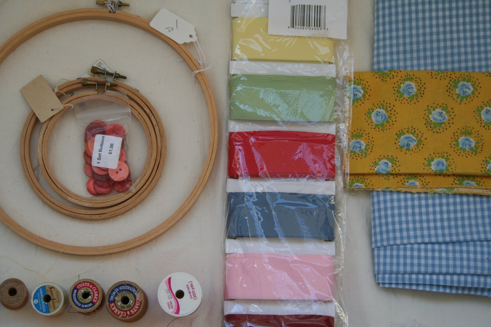 Eu estava obviamente interessada em objectos pequenos e portáteis: ou seja, materiais de costura. Aqui está o que comprei: bastidores (para fazer isto), tecidos, botões, um conjunto de fitas de gorgorão e carrinhos de linhas (alguns vintage, outros mais actuais).