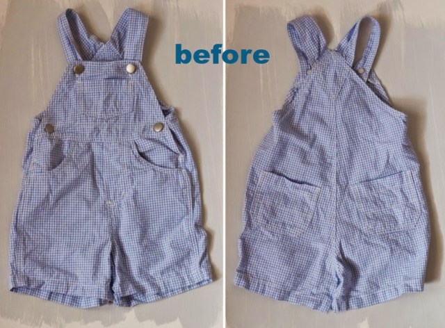 Quando estava grávida do Pedro, comprei estas jardineiras numa loja de caridade aqui das redondezas — achei que, por apenas NZD$2, ficava com uma peça de roupa clássica e fresca (o tecido é bem mais fino do que parece nas fotografias). No entanto, quando — meses mais tarde — fui buscar à garagem toda a roupa de bebé, encontrei umas jardineiras quase iguais… por isso, pus estas de parte e não pensei mais no assunto.