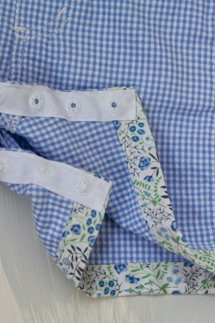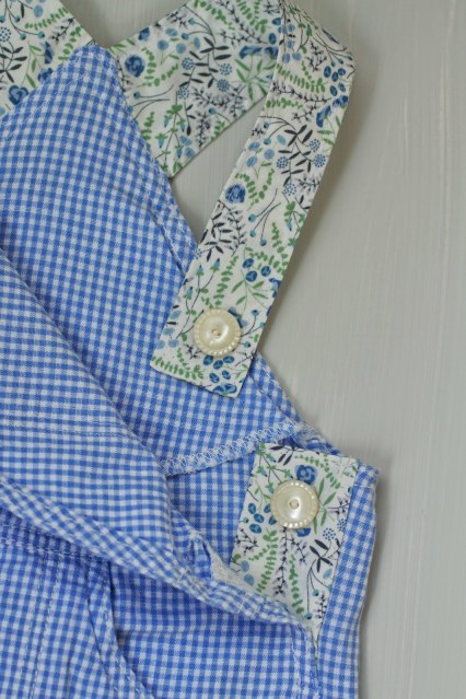 I picked a floral fabric in the same tones as the original dungarees (you can never go wrong with some Liberty) and used it to make new straps, button tabs and the front pocket, as well as binding for the legs and back pockets. I also replaced the buttons, stitched over the faux fly and added snap tape for easier nappy changing (tutorial).