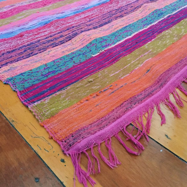 Uma semana depois de ter requisitado o dito livro, estou em Auckland com o Tiago, numa pop-up shop cheia de tecidos indianos. Dobrados num canto estão cinco ou seis tapetes feitos de saris reciclados… cheios de cor, textura, completamente diferentes de tudo o que tenho visto ultimamente… e surpreendentemente baratos! E ocorre-me que um dos tapetes seria ideal para cobrir a tal mesa de café que vi no livro, já que não tenho um daqueles cobertores galeses nem nada que se assemelhe…