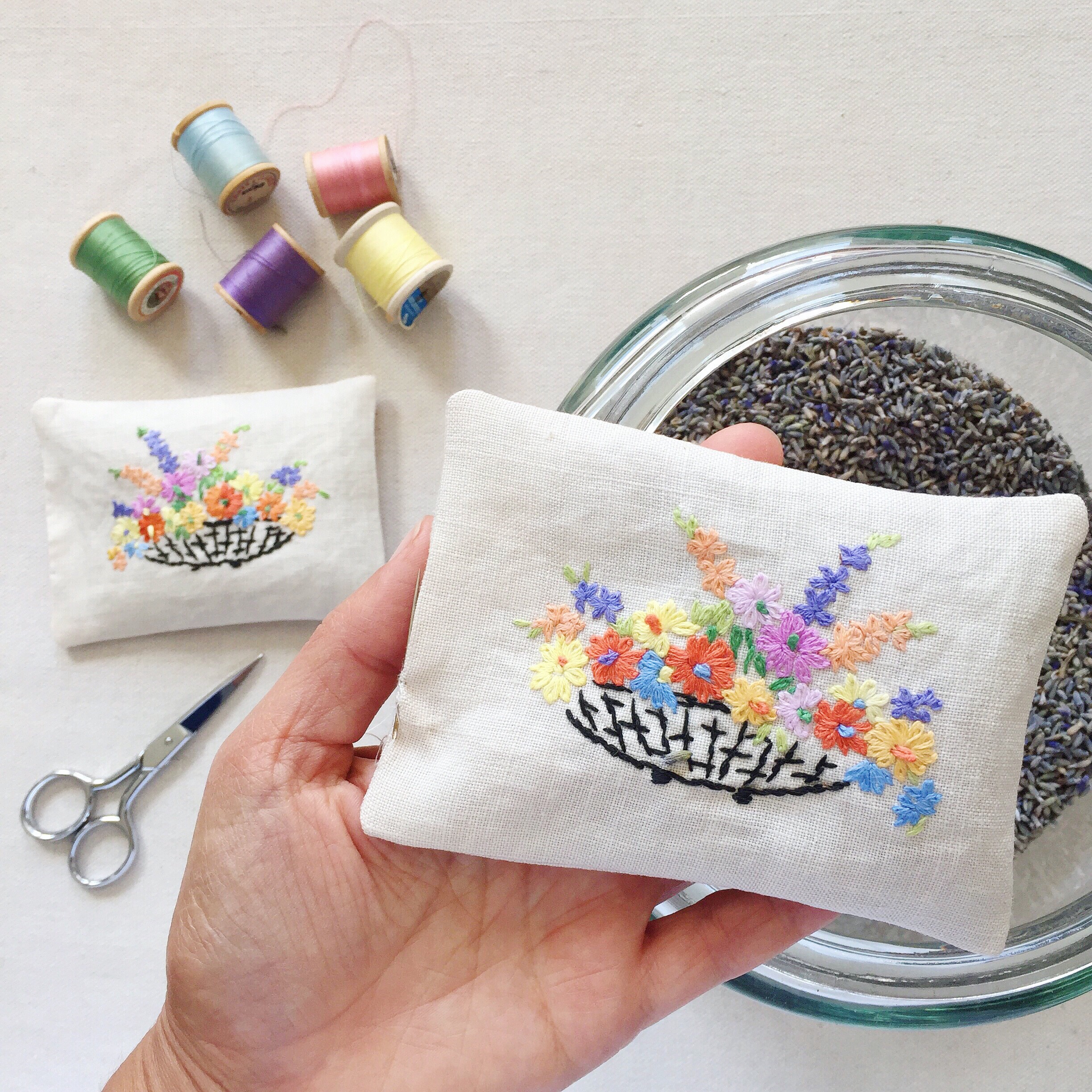 Muitos dos bordados antigos neozelandeses que compro nas lojas de caridade estão em mau estado: têm rasgões, partes desfeitas ou nódoas impossíveis de tirar. Esses panos são candidatos ideais para serem cortados e transformados em saquinhos de alfazema.