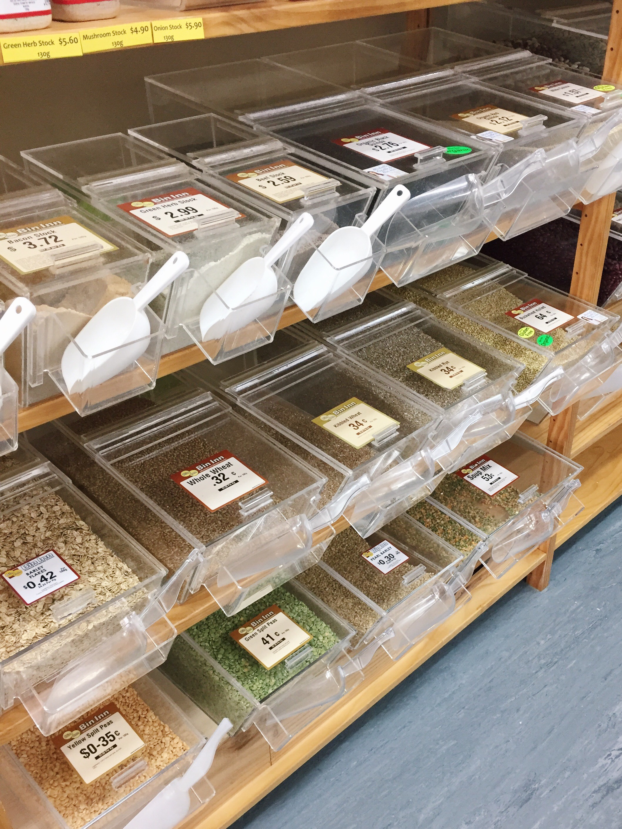 Na Nova Zelândia há uma cadeia de lojas de venda de produtos a granel chamada Bin Inn. Para além de oferecer uma grande variedade de produtos difíceis de encontrar num supermercado normal, tem, quanto a mim, uma enorme vantagem: as pessoas que frequentam a loja são encorajadas a usar os seus próprios recipientes.