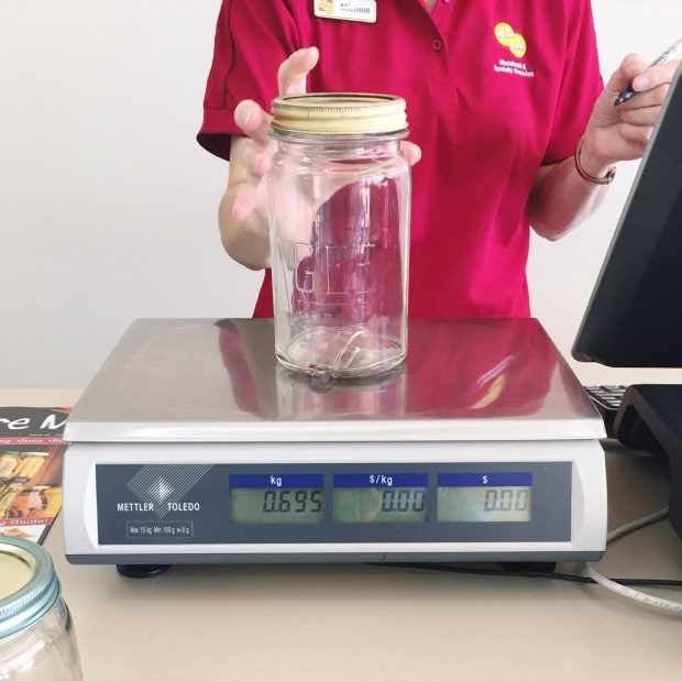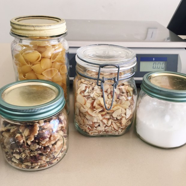 Ao longo dos anos tenho comprado um número considerável de frascos de vidro em lojas de caridade, que uso para tudo e mais alguma coisa. São estes os frascos que levo ao Bin Inn. Quando chego, a dona da loja pesa os meus frascos e anota os pesos na parte de baixo de cada frasco. No fim, depois de os frascos estarem cheios, volta a pesá-los e subtrai o peso inicial. Eu venho para casa com as compras já arrumadas e a sentir um grande alívio por ter evitado usar embalagens que rapidamente acabariam no lixo.
