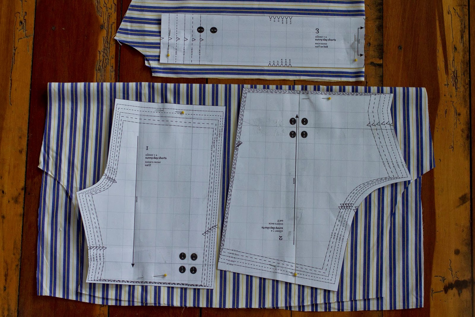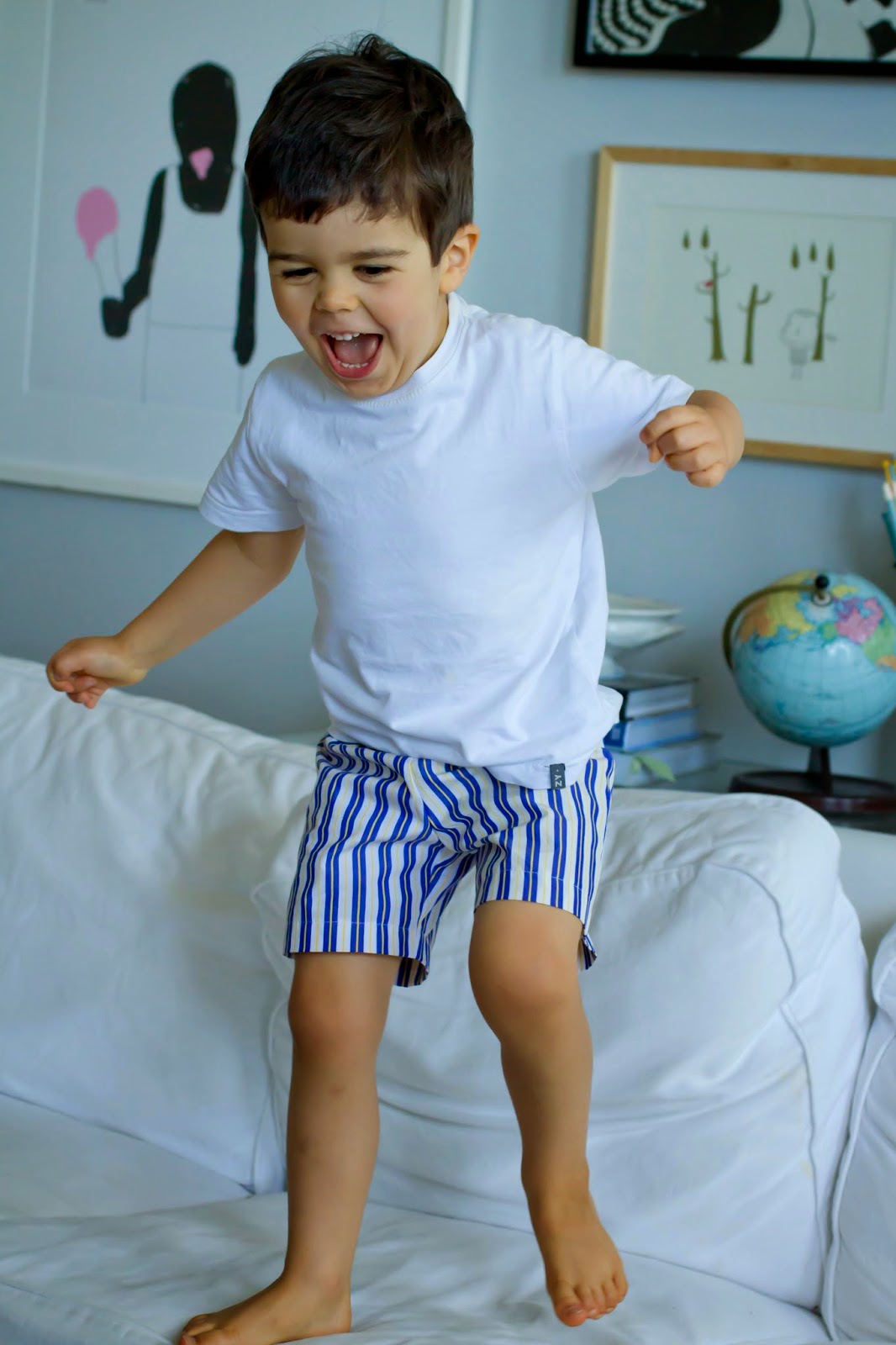 Com a chegada do Verão, o Rodrigo estava a precisar de pijamas frescos. À semelhança daquilo que fiz há dois anos, aproveitei camisas do meu pai e do Tiago para fazer-lhe quatro pares de calções, mas desta vez usei um molde diferente: os Sunny Day Shorts do Oliver + S.