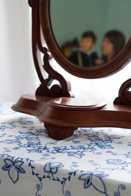 To make the table we’ve used an inexpensive MDF board and some spare Ikea table legs we had in the garage. After putting the table together (Rodrigo was a great little helper… he shows signs of being very keen on DIY!) I covered it with two old tablecloths that were in a terrible state: darned in too many places and full of those yellow spots that are so hard to get rid of. The mirror was bought in a nice antique shop in Woodville.